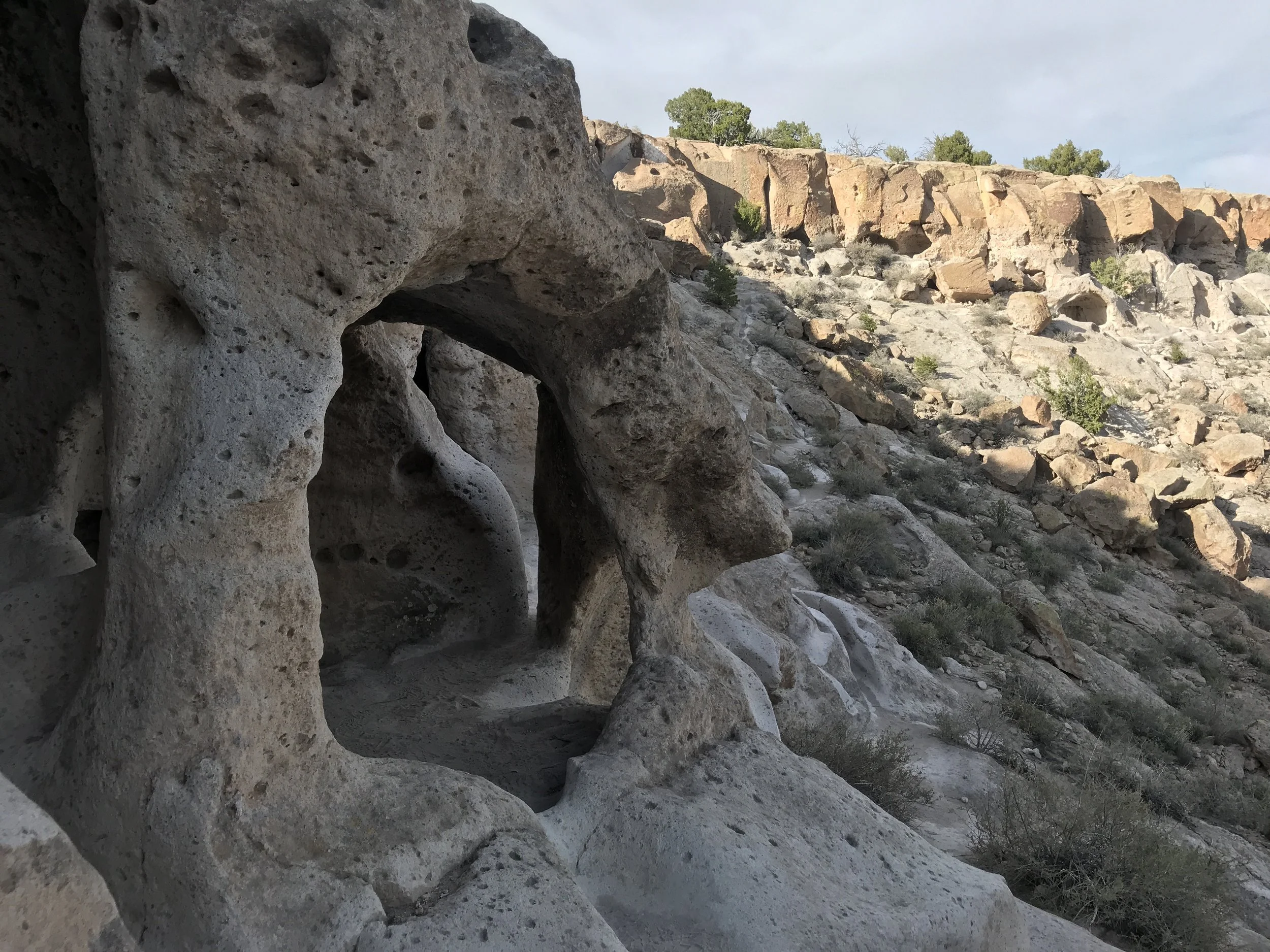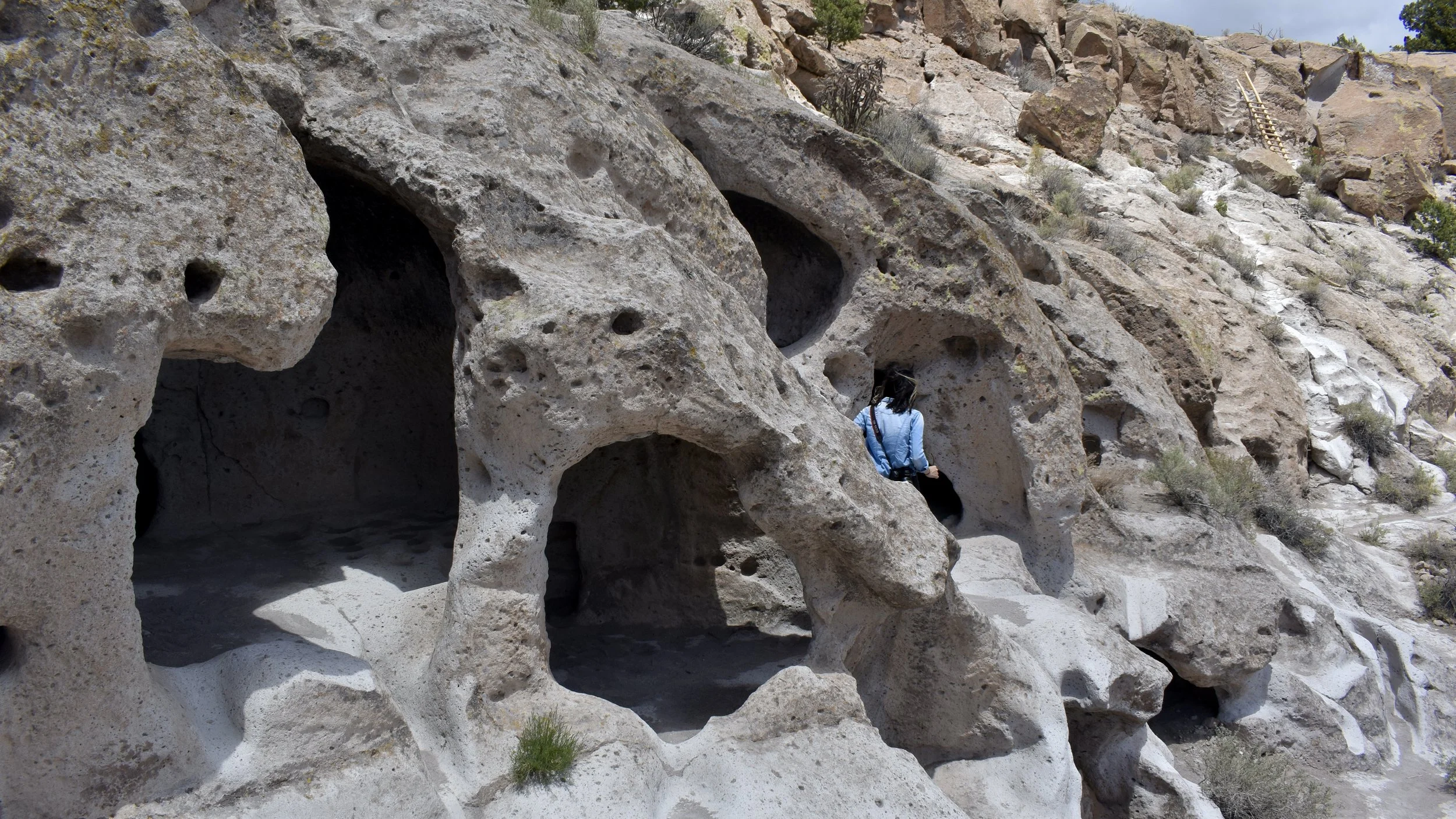 Occasionally you’ll notice that you’re walking in the same carved pathway that the ancients built for themselves out of the easily carved volcanic tuff that spewed out of the Valles Caldera eons ago. And where the ladders are now are probably where they were then as well.
