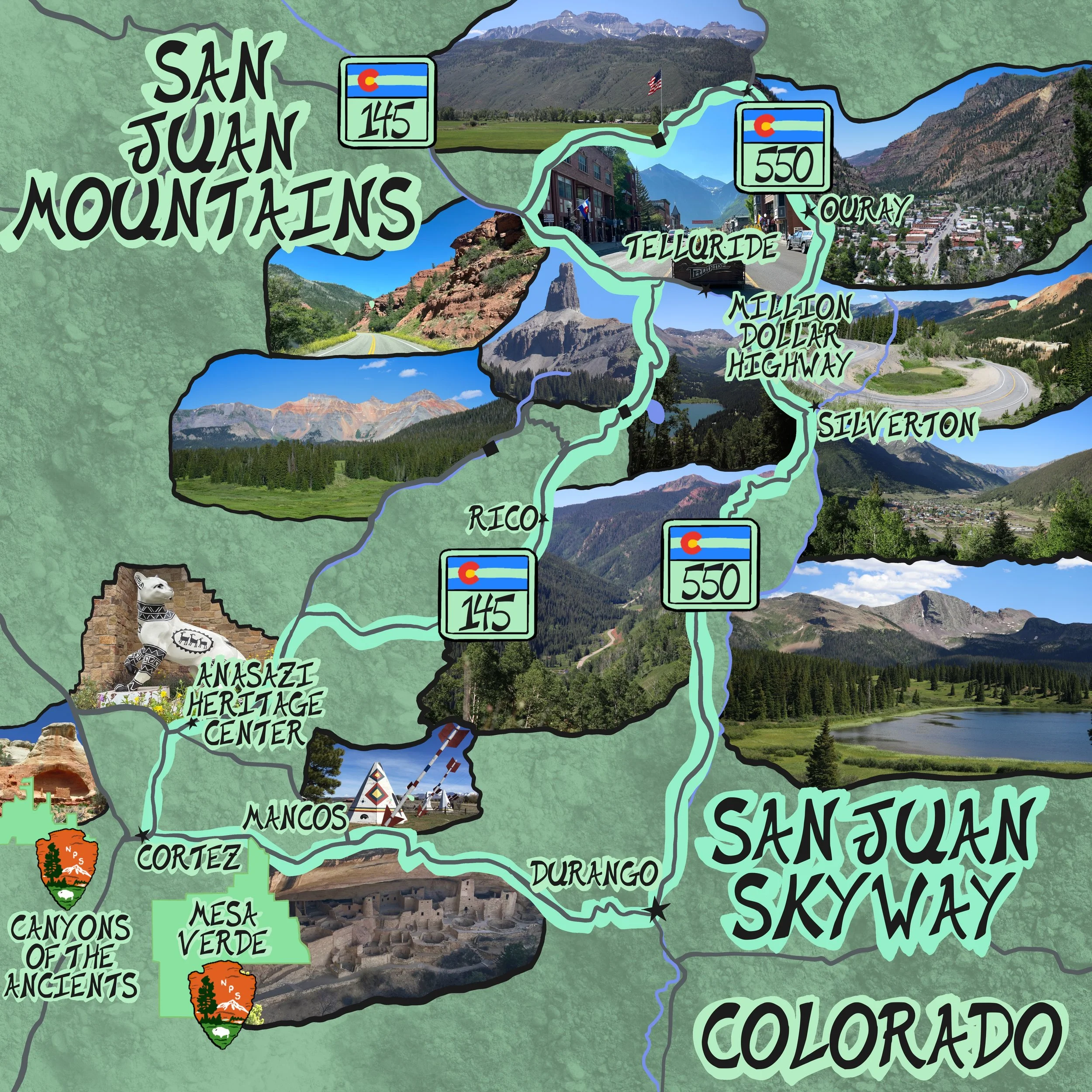 The Million Dollar Highway, Sate Highway 145, Telluride, Durango, Cortez, Rico, Ridgeway, Silverton, Ouray, Canyons of the Ancients National Monument Visitor Center and Museum, Mesa Verde National Monument, plenty of 14ers, fantastic passes, views, hikes, & 4WDrives are all included on this world class scenic route.